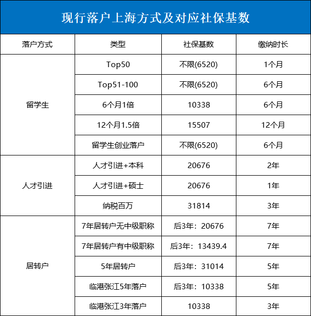 2023年落户上海不同的方式社保成本对比不符合社保缴纳基数的申办人要调整,一般有三种情形:1、 系统自动调整:如果单位人事在做工资申报的时候,你去年的平均工资高于10338元,就不用担心了,系统会自动调整;2、 网上社保基数调整:需要公司人事在上海社保自助经办平台进行调整,调整当月需要补缴之前的社保差额;3、 更换单位调整社保基数:可操作时间是每月5日—26日,要求社保账户由原单位转到新单位,才可以用这种方式进行调整。上海落户不认可的个税社保缴纳方式:1、社保在上海,个税在外地;2、社保第三方缴纳,个税本单位申报;3、社保最低基数,个税按实际工资;下一年度仍旧按最低基数缴纳社保。【 热门问题汇总 】1、何时能调整社保基数?每年调整一次社保基数,目前是7月份。2、社保和个税合理匹配是每个月匹配吗?不是。今年的社保基数跟上一年度“年度个税”所推算的月均收入基本匹配。3、只要社保和个税匹配就可以了吗?不尽然。还要看合理性,社保基数能每年稳步提升最佳,不要从最低一下子提高到两、三倍。个税每月都要按实际收入正常申报,不能一年里大部分时间是零申报,最后年底一下缴纳很多。除了社保和个税这个审核重点,还有关于学历、职称、档案等方面的问题,也能拦住不少申报人。所以想要落户上海,一定要根据自己的实际情况提前规划适宜的落户方案。如果你未来想长期在上海发展,工作生活,还没有上海的购房资格就早点想办法上海落户,早落户享受!