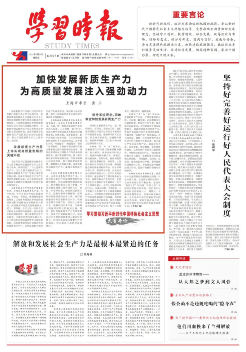 【学习时报】5月24日刊发:上海市市长龚正:加快发展新质生产力,为高质量发展注入强劲动力.